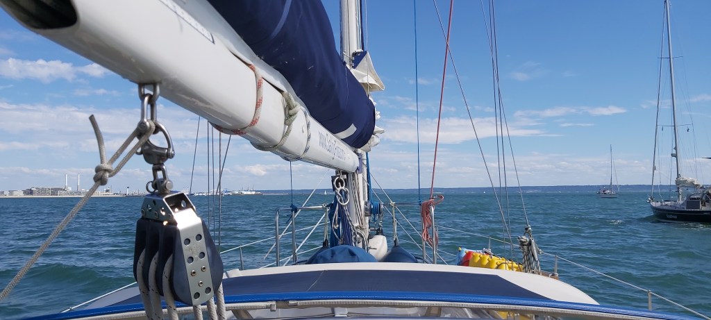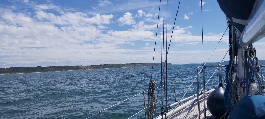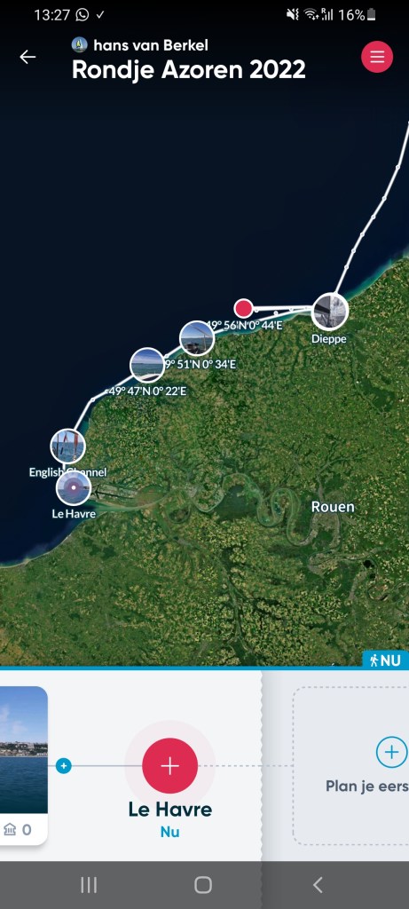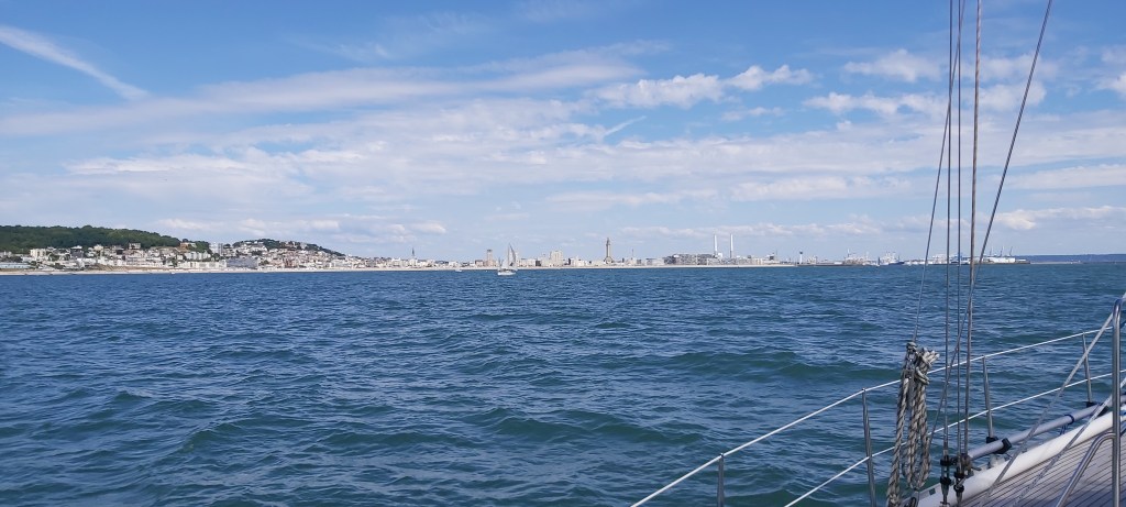 Helaas het vangen van vis met de hengel is tot nu toe nog niet gelukt. We komen aan bij Le Havre en sturen dicht langs de kust om het net iets diepere deel te volgen en we beperken daarmee een stuk omvaren door niet de vaargeul aan te houden.