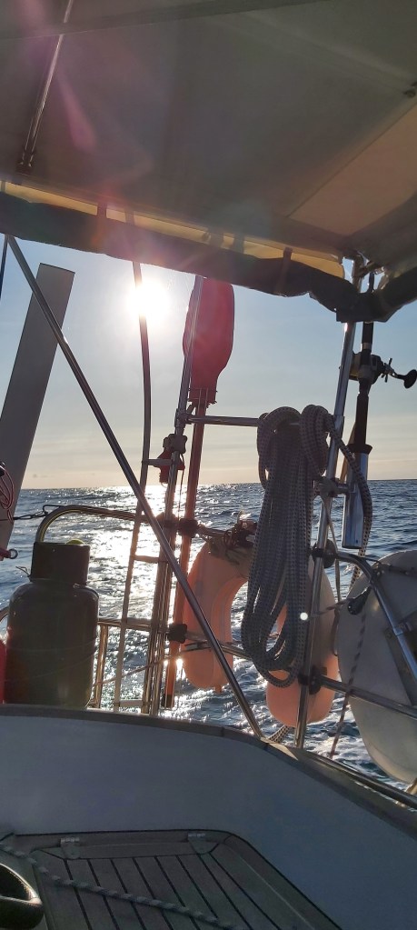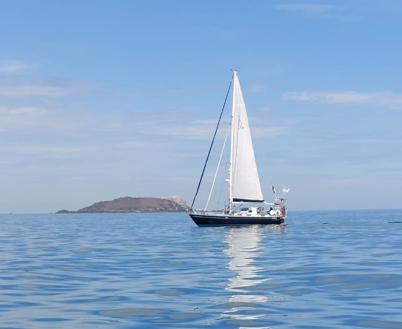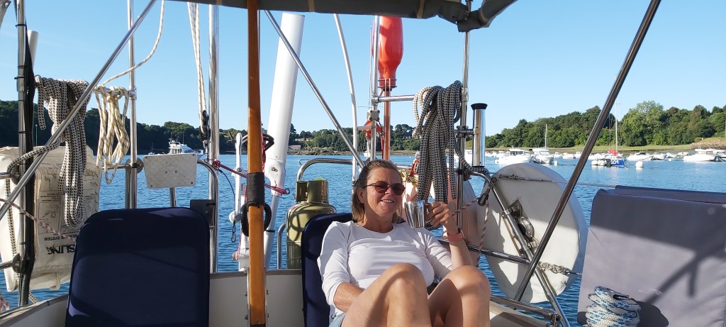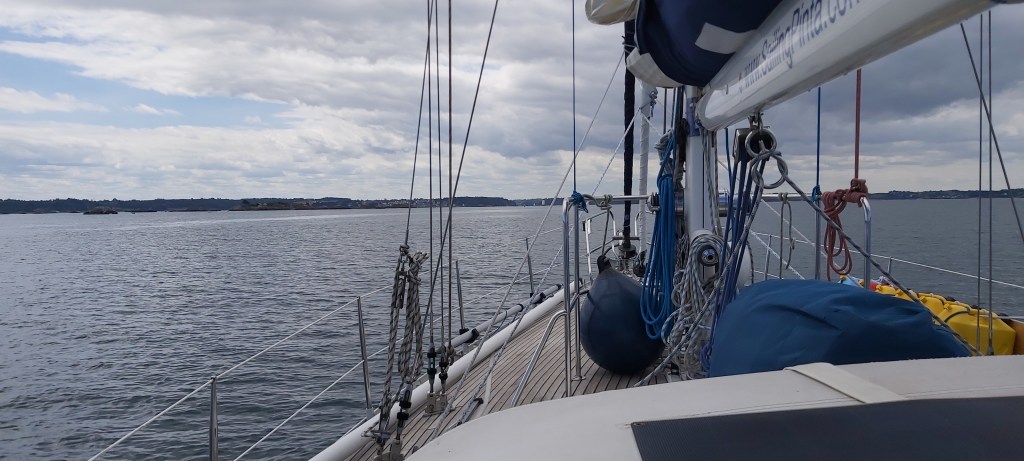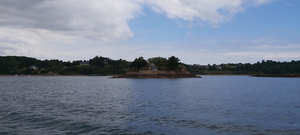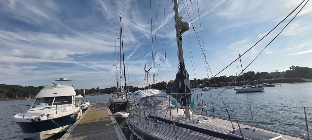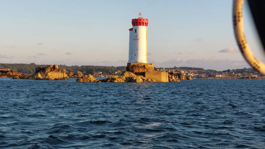 We genieten van de terug tocht en eten weer gezellig een hapje en gaan we vroeg onder de veren. Na 5 dagen liggen aan het ponton kunnen we concluderen. We hebben meer dan genoeg water. De accu’s worden goed gevuld door de zonnepanelen en de windmolen. Het eten zwemt om je heen of hangt aan het ponton. We gaan weer verder en maken plannen voor Roscoff. 0600 uur de wekker en 0700 uur gooien we los. We varen de rivier af naar de zee. We hijsen de zeilen en varen een prachtige tocht tussen de rotspartijen door.